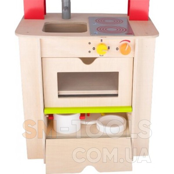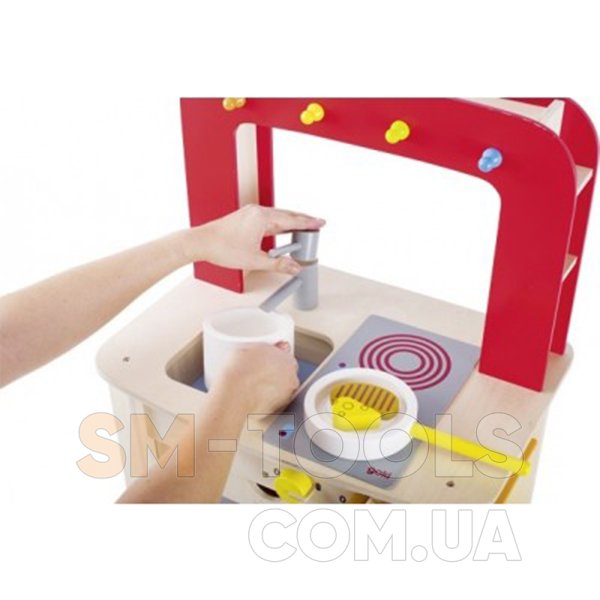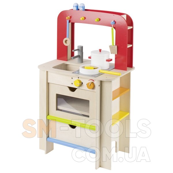 Деревянная кухня от немецкого производителя Goki является лучшим помощником юному повару для изучения азов искусства еды. В компактной кухне для ребёнка есть всё - плитка на две конфорки, посуда, чтобы готовить и мойка, где всё грязное можно "помыть". Также есть духовка, тумбочки и полочки для хранения необходимой кухонной утвари. Детали набора изготовлены из натурального дерева и окрашены водостойкой безопасной краской.