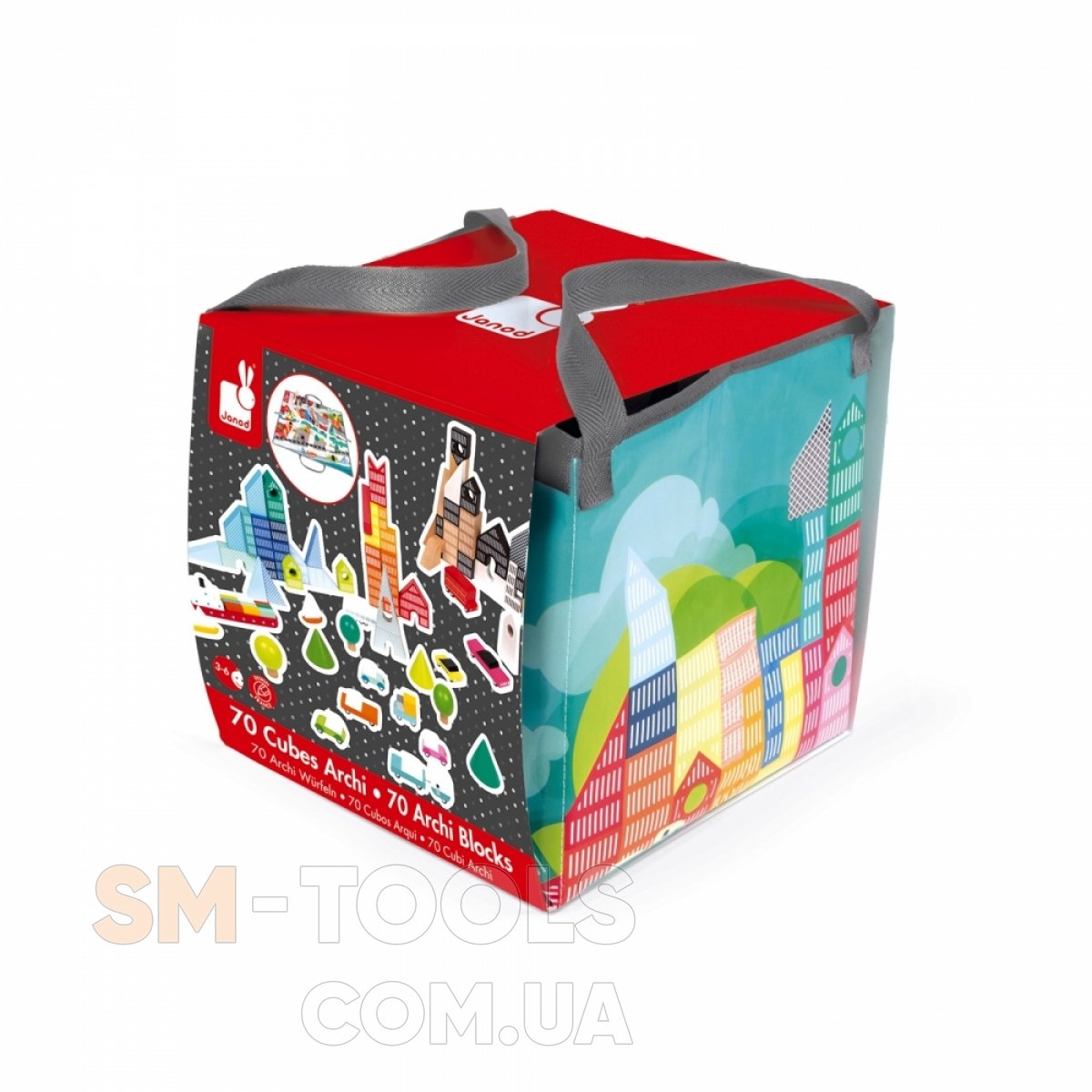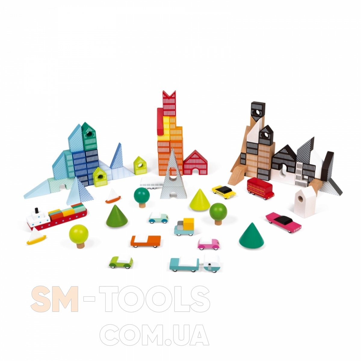 В наборе 70 деревянных деталей различных форм: в виде треугольников, параллелепипедов, конусов и других нестандартных форм (например, в виде деревьев, автомобилей, лодки). Элементы изготовлены из качественной, натуральной древесины (китайской вишни), покрытые нетоксичными красками на водной основе.