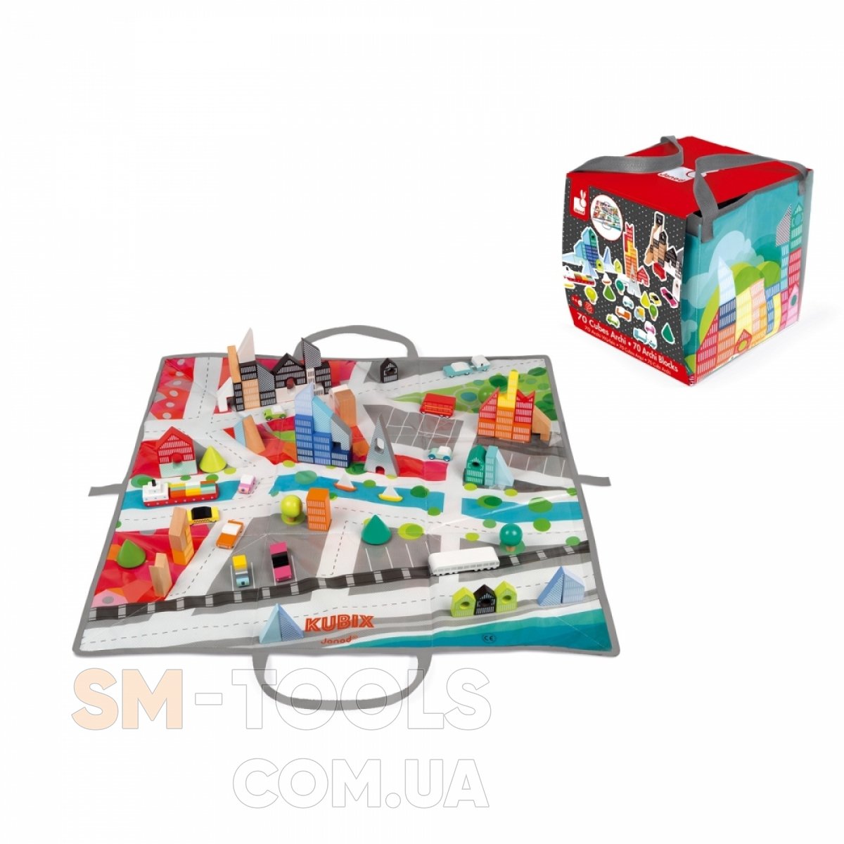 «Город» - многофункциональный игрушечный набор. Это и кубики, и конструктор, и сюжетно-ролевой набор. В комплекте 70 деревянных деталей различных форм и размеров. Все эти детали - элементы для строительства современного города с небоскребами, башнями, другими архитектурными сооружениями, транспортными средствами (среди которых автобусы, автомобили, поезд и корабль). В комплекте даже фигурки в виде деревьев. Ребенок сможет построить в пределах города парки - то, без чего невозможно представить современный городское пространство. Роль города с улицами выполняет текстильная коробка для хранения набора. Нужно просто развернуть ее на полу. Размер «площадки» для строительства города в развернутом виде составляет 75х75 см. Набор для детей от 1 года.