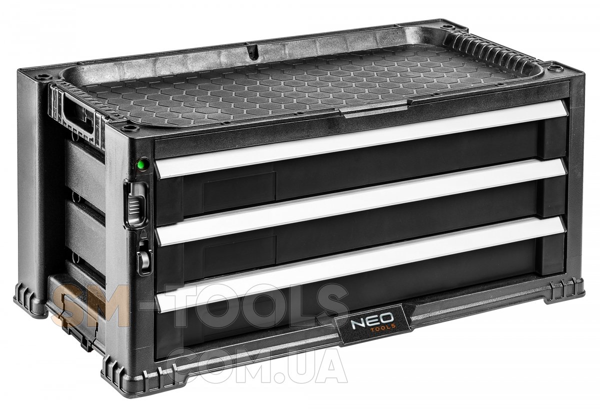 Тележка для инструмента, 3 выдвижных ящика NEO - это практичная и прочная тележка с модульной конструкцией. Такая конструкция позволяет быстро и легко соединять модули друг с другом, что значительно повышает ее универсальность. Тележка оснащена дополнительными контейнерами, что повышает комфорт работы. Кроме того, выдвижные ящики снабжены блокиратором, а также имеются скобы для навесного замка, что обеспечивает безопасность инструмента. Бренд NEO оправдывает ожидания профессионалов.