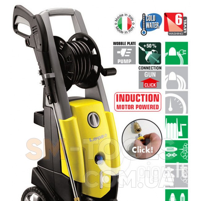 На данной мойке установлен асинхронный двигатель с тремя стальными поршнями, алюминиевая головка насоса со встроенным пропускным клапаном. Двигатель характеризуется очень низким уровнем шума. Система автоматической остановки. Встроенный бак для моющего средства для прямого всасывания. На мойке установлена катушка для шланга, что облегчает ее использование. Держатель кабеля. Конструкция с эргономичной ручкой обеспечивает отличную мобильность. Пистолет с быстрым подключением. Копье с 4 насадками (0 °; 15 °; 40 °; химический продукт). Легкий доступ к насосу.