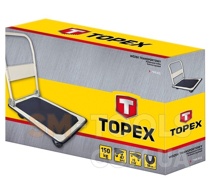 Тележка TOPEX размером 72 x 47 x 82 см, масса 8.9 кг. Крепкая тележка, изготовлена из стальных профилей, с максимальной нагрузкой до 150 кг. Основание покрыто антискользящим материалом. Тележка оснащена саморегулируемыми колесами, что облегчает маневрирование в тесных помещениях. Бренд TOPEX предназначен для домашних мастеров.