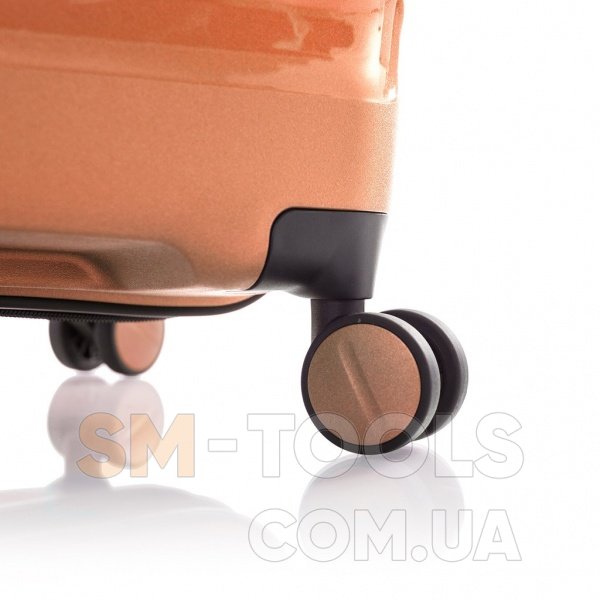 Чемодан оснащен четырьмя полноповоротными колесами системы Spinner с возможностью независимого разворота каждого колеса на 360 °. Системой предусмотрено равномерное перераспределение нагрузки на каждое колесо, что в свою очередь способствует плавному качению и маневренности чемодана, прилагая при этом минимум усилий.