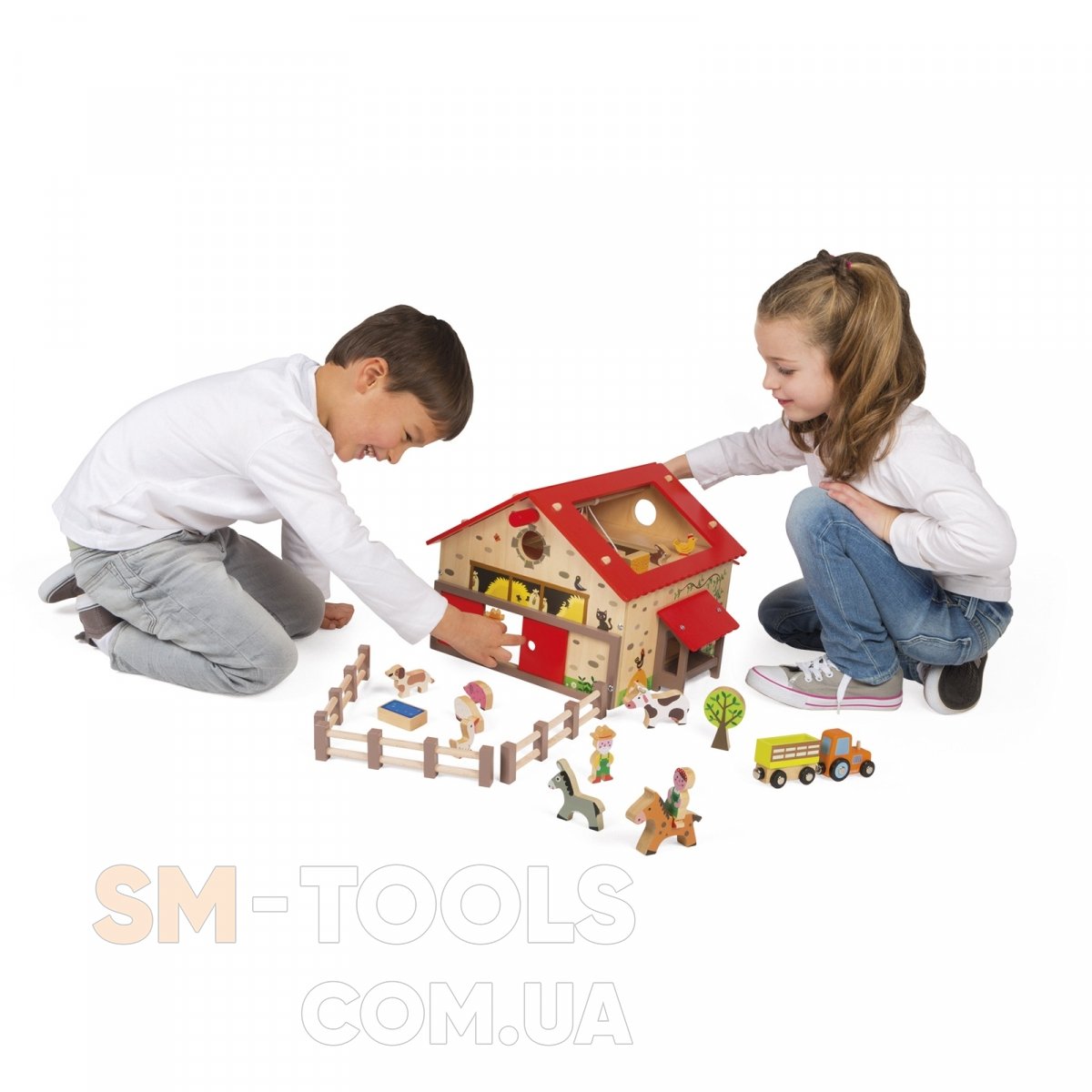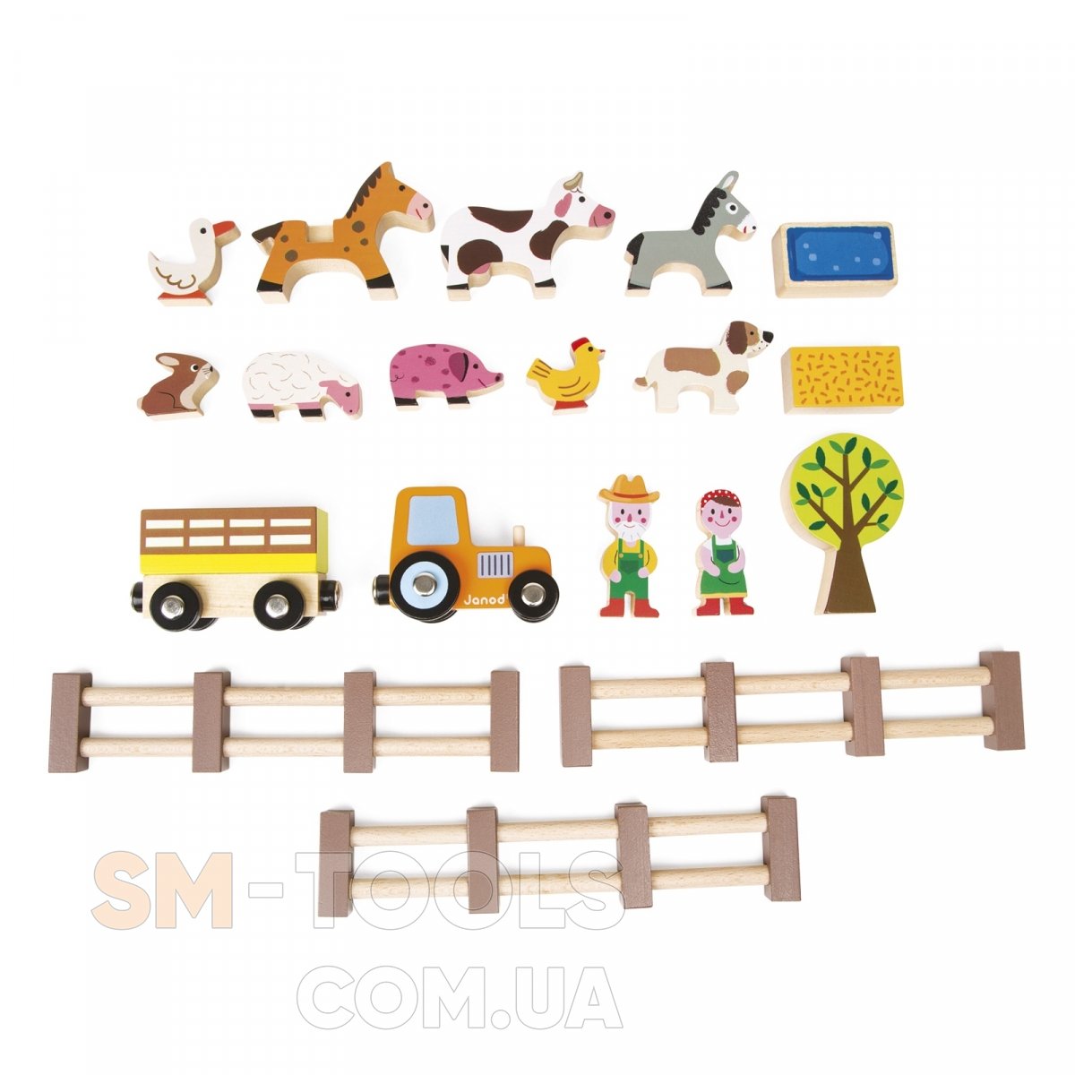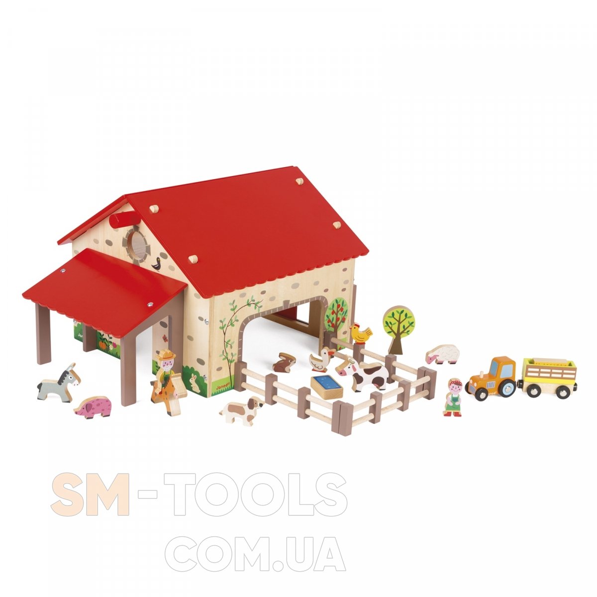 Удивительный и яркий игровой набор «Ферма» от Janod. Кроме большого фермерского домика, в наборе ребенок найдет фигурки двух фермеров, трактор с прицепом, забор (3 части), дерево, а также разнообразные фигурки животных: курица, свинья, овца, осел, лошадь, кролик, корова, собачка, уточка и другое. В одной из частей крыши имеется отверстие, через которое дети могут расставлять персонажей на втором этаже. С таким игровым набором фантазия детей не ограничена. Все элементы произведены из натурального дерева, оно качественно обработанное и приятное на ощупь.