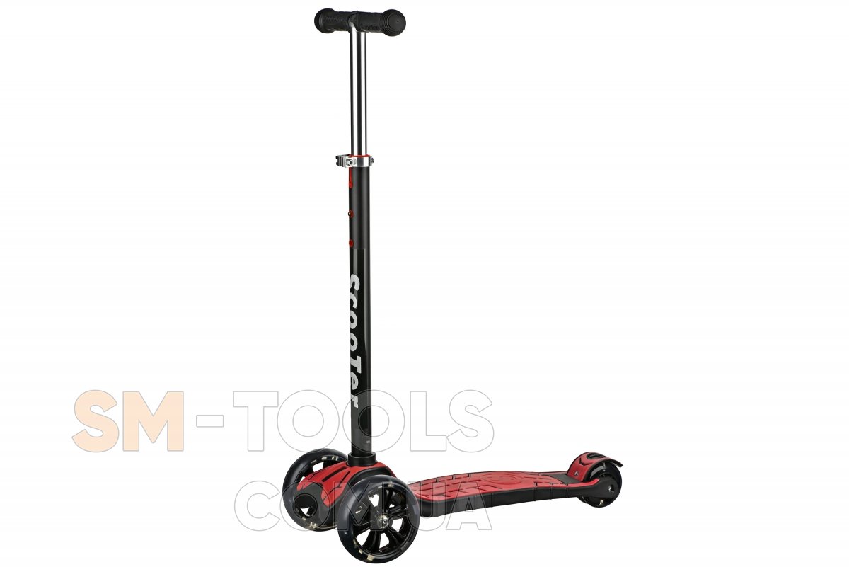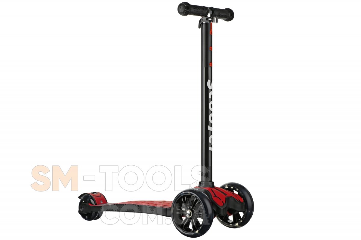 Красный детский трехколесный самокат Same Toy для детей от 3-х лет. Колеса полиуритановые мягкие. Диаметр колёс: 120 мм PU - передние со светом и 80 мм PU - заднее. Заднее колесо двойное, передние широкие. Резиновые ручки с ограничителями на концах, пластмассовый тормоз, поворачивает наклоном руля.