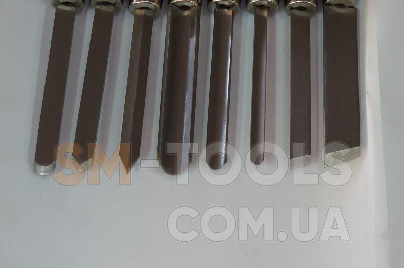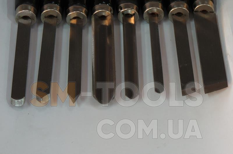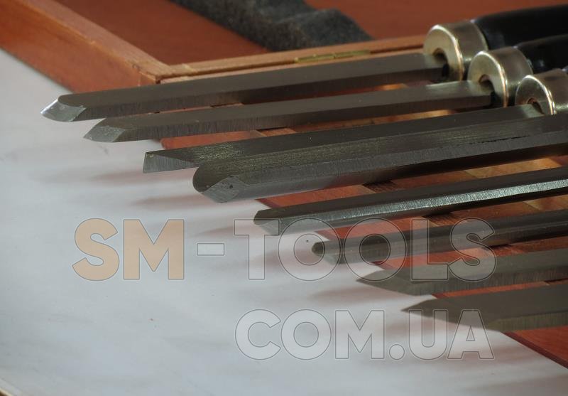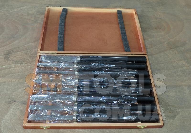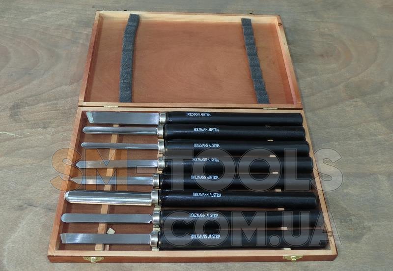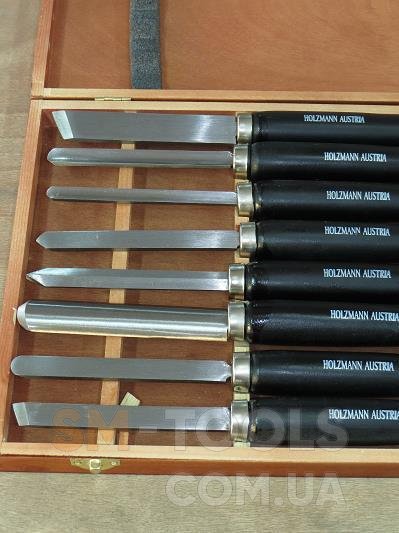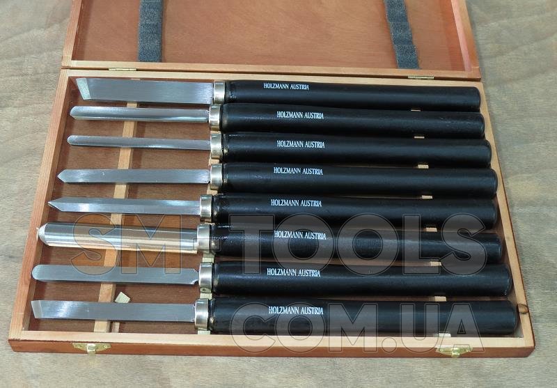 Качественный комплект резцов из восьми штук. В них входит 3 черневых и 5 фигурные. Черневые предназначенные для обработки в круг. Фигурными обрабатывают уже по рисунку. Каждый резец изготовлен для большинства стандартных изделий. Компактная коробка для хранения и перемещения, небольшие размеры позволят хранить в удобном для Вас месте. Вес комплекта около двух килограмм. Изготовлены Австрийской фирмой Holzmann.