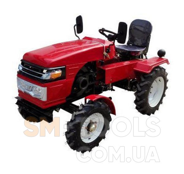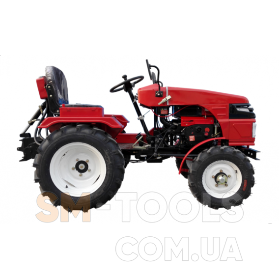 Заднеприводный минитрактор с колесной базой 4х2 выполнен на базе четырехтактного двигателя Д-151 с оборотами 903см3 и объемом топливного бака 11л. Оборудование развивает мощность до 15 л.с.