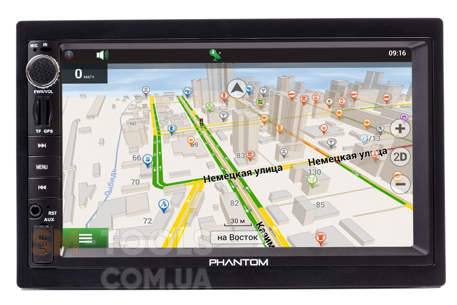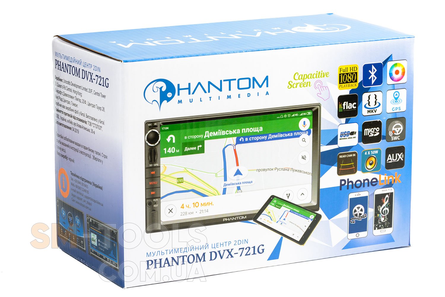 PHANTOM DVX-721G – это 2DIN мультимедийный центр, предназначенный для установки в автомобили. Мультимедийный центр для авто PHANTOM DVX-721G позволяет его владельцу оснастить свой автомобиль современным устройством, повышающим комфорт и безопасность вождения. Головное устройство PHANTOM DVX-721G совместимо со штатным оборудованием автомобиля – поддерживаются кнопки на руле (резистивные, есть режим обучения). Меню мультимедийного устройства русифицированное. Многоцветная подсветка клавиш PHANTOM DVX-721G включается при запуске автомагнитолы. Также возможна плавная регулировка яркости, контрастности и насыщенности экрана. Благодаря установке 2DIN магнитолы PHANTOM DVX-721G пользователь получает современные, необходимые в дороге функции: Навигация, FM радиоприемник с памятью на 18 FM станций: возможность слушать в дороге любимую музыку; просматривать видеофайлы и фотографии с различных носителей (USB – флешкарты, микро – SD карты). Благодаря встроенному модулю громкой связи Bluetooth (с отображением русскоязычной телефонной книги) в процессе езды на автомобиле удобно и безопасно пользоваться мобильной связью.Также можно подключить камеру заднего вида, что существенно облегчит парковку и движение задним ходом в условиях ограниченной обзорности. Есть возможность подключения видеопарктроника Fighter FPS-01V. Отдельный AV-вход, которым оснащен 2DIN мультимедийный центр PHANTOM DVX-721G, позволяет подключить камеру фронтального обзора или внешний цифровой ТВ-тюнер DVB-T2. Установка PHANTOM DVX-721G в различные модели автомобилей облегчается благодаря наличию кабеля с разъемом ISO и монтажным креплениям. Возможен выбор логотипа автомобиля на заставку (предустановлено 47 логотипов). Посредством функции PhoneLink к мультимедийному центру PHANTOM DVX-721G можно подключить смартфон на ОС Android и iOS.