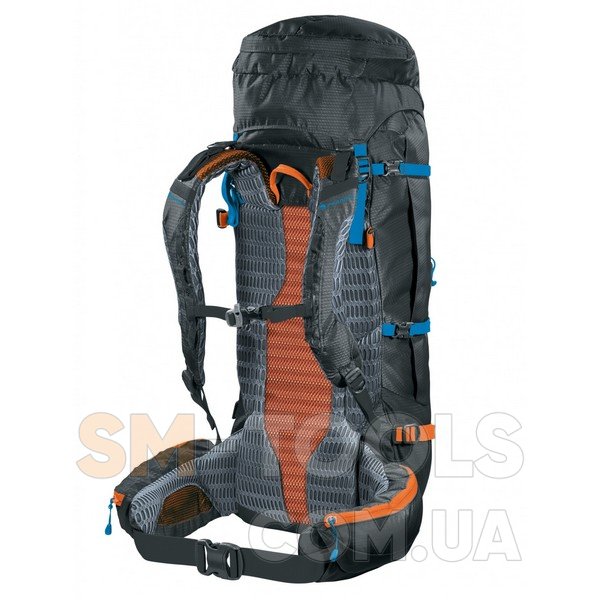 Trekking poles holders (2) - держатели для треккинговых палок размещаются в верхней и нижней части фасада треккингового рюкзака и, представляют собой комбинацию нижних регулируемых петель с лямками и верхних эластичных стяжек со стоперами. Такие держатели позволяют надежно фиксировать треккинговые палки и не загружать ими внутреннее пространство рюкзака. Данный рюкзак имеет две пары съемных креплений для треккинговых палок, совмещенных с креплениями для ледорубов.