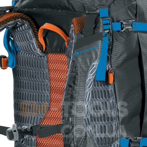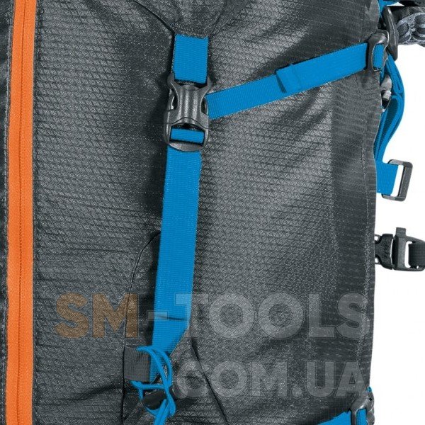 Ice-axe holders (2) - держатели для ледорубов размещаются в верхней и нижней части фасада альпинистского рюкзака и, представляют собой комбинацию нижних регулируемых петель с лямками и верхних эластичных стяжек со стоперами. Такие держатели позволяют надежно фиксировать ледорубы и не загружать ими внутреннее пространство рюкзака. При необходимости держатели могут быть использованы и для крепления треккинговых палок. Данный рюкзак имеет две пары креплений для ледоруба, совмещенных с креплениями для треккинговых палок