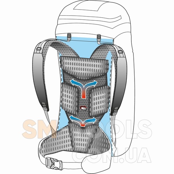 - Спина: благодаря системам Hollow Back System и Air Convector Tech Back является мягкой, но при этом упругой и хорошо вентилируемой. Гофрированная, перфорированная подкладка из EVA-пены и покрывающая ее сеточная ткань создают между спиной пользователя и спинкой рюкзака постоянное движение потока воздуха по микровентиляционным каналам. Валики с мягкой пенополиуретановой подкладкой обшиты дышащей сетчатой тканью.