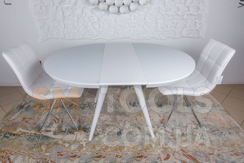 Столешница сделана из МДФ с поверхностью из стеклокерамики. Стекло обработано пескоструйным и шелкографным аппаратами, цвет - белый. Для сохранности идеального внешнего вида стеклянной поверхности рекомендуется использовать подставки или салфетки под тарелки и столовые приборы. Дополнительные панели из МДФ белого цвета располагаются посередине, механизм "бабочка".