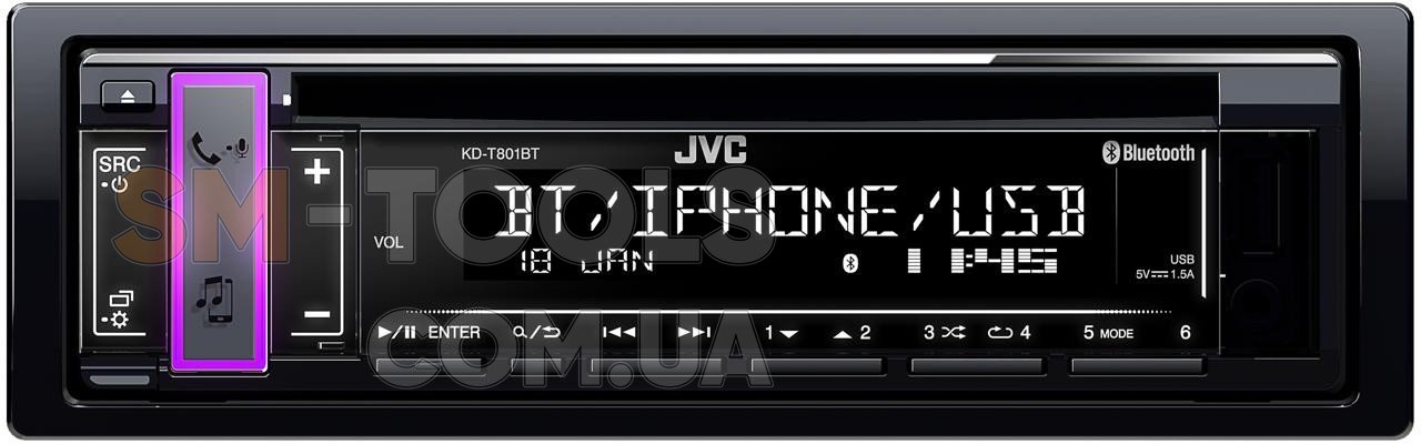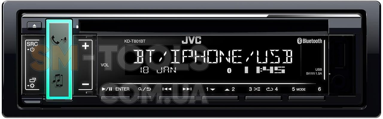 Цифровой ресивер JVC KD-T801BT в черном корпусе имеет компактные размеры. Помимо этого у него множество плюсов: высокочувствительный FM-тюнер, вещающий радиостанции в диапазоне FM, что позволит слушать любимую радиостанцию в дороге и наслаждаться лаконичным звучанием. МР3-декодер, преобразовывающий цифровой сигнал в чистый звук. Устройство читает аудио форматы МР3. Его монохромный дисплей потребляет минимум энергии, несмотря на это, информация на нем читается превосходно.