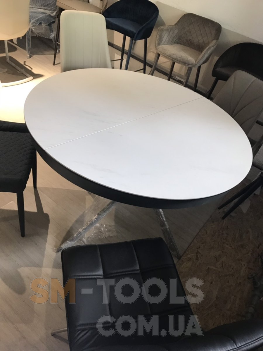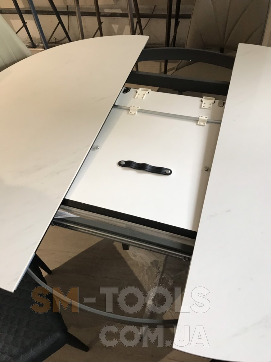 Вкладка смонтирована на каркасе и позволяет увеличить длину стола на 50 см, делая форму стола овальной.