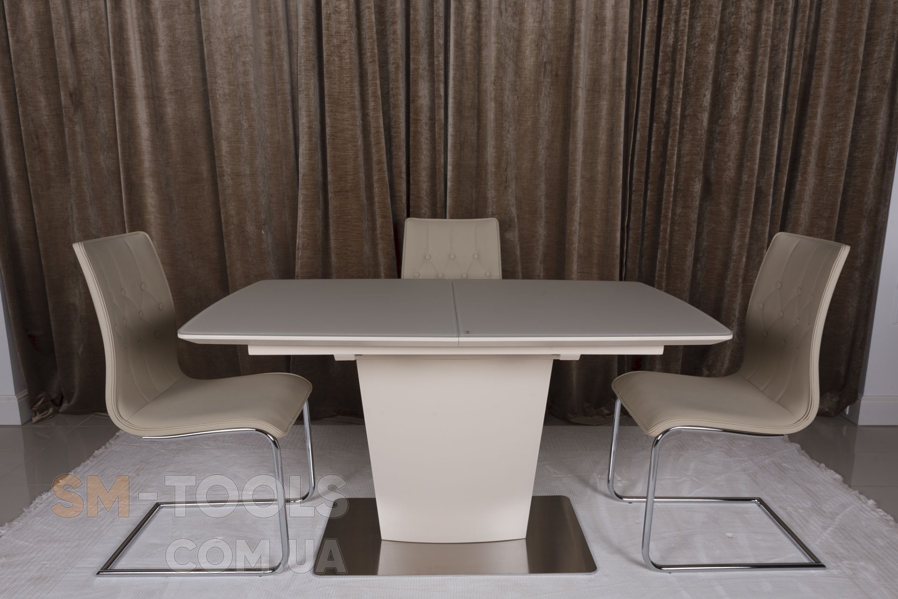 Стильный раскладной обеденный стол, выполненный в современном дизайне. Столешница изделия-из МДФ, покрытой каленым стеклом. Нога-МДФ, изножье-сталь.