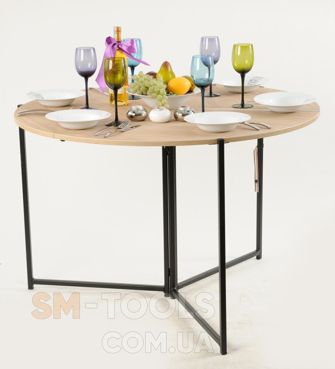 Легкость, эргономичность, мобильность и мега компактность это всего лишь малая доля положительных качеств изделия. Данного типа стол идеально подойдет для кухни, гостинной, столовой, дачи, а так же любой небольшой площади, на которой нет возможности установить стационарный большой стол. За несколько небольших движений изделие в сложенном виде размером В*Ш*Толщина - 1200*580*100(мм) превращается в стол диаметром 1100мм и высотой 750мм, за которым может разместиться 4-6 человек одновременно!