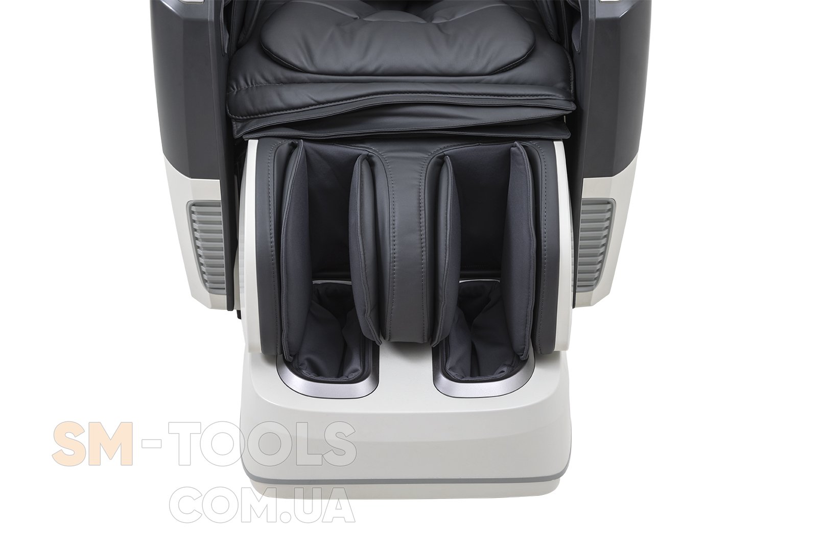Массажный блок для ног делится на 2 части: нижняя - для стоп, верхняя - для икр. В верхней части есть и воздушно-компрессионный массаж, и инновационный растирающий массаж икр. Благодаря этим уникальным механическим круговым движениям вы избавитесь от усталости ног, ваши мышцы расслабятся. Это намного эффективнее, чем компрессионный массаж.