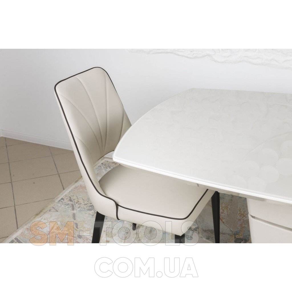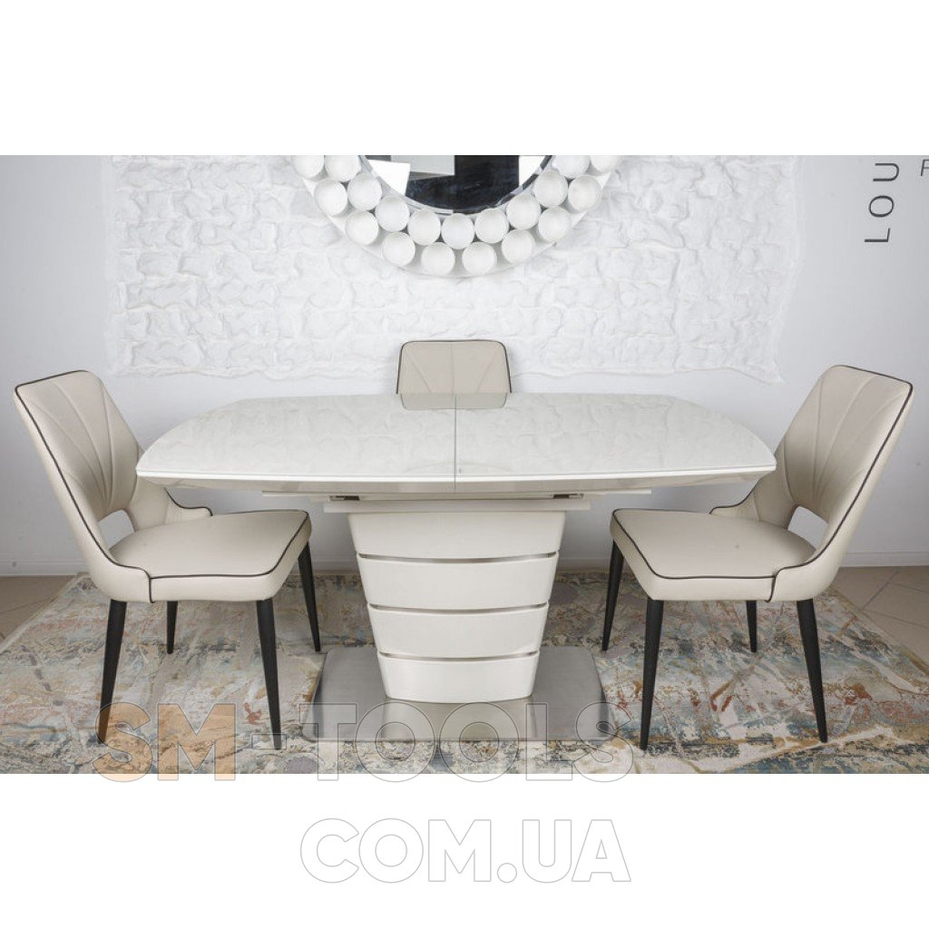 Столешница сделана из глянцевого закаленного стекла кремового цвета на базе из МДФ. На такой столешнице могут быть хорошо заметны отпечатки пальцев и следы от посуды, поэтому мы рекомендуем использовать подставки или салфетки под тарелки и столовые приборы. Дополнительные панели располагается посередине, сделаны из МДФ в тон столешнице. Чтобы разложить стол, нужно просто раздвинуть стеклянную столешницу и достать вставки. Детали раздвижного механизма сделаны из металла и рассчитаны на длительный срок эксплуатации.