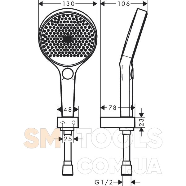 Состоит из: ручной душ, держатель для душа, душевой шланг