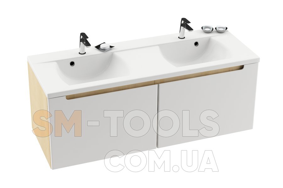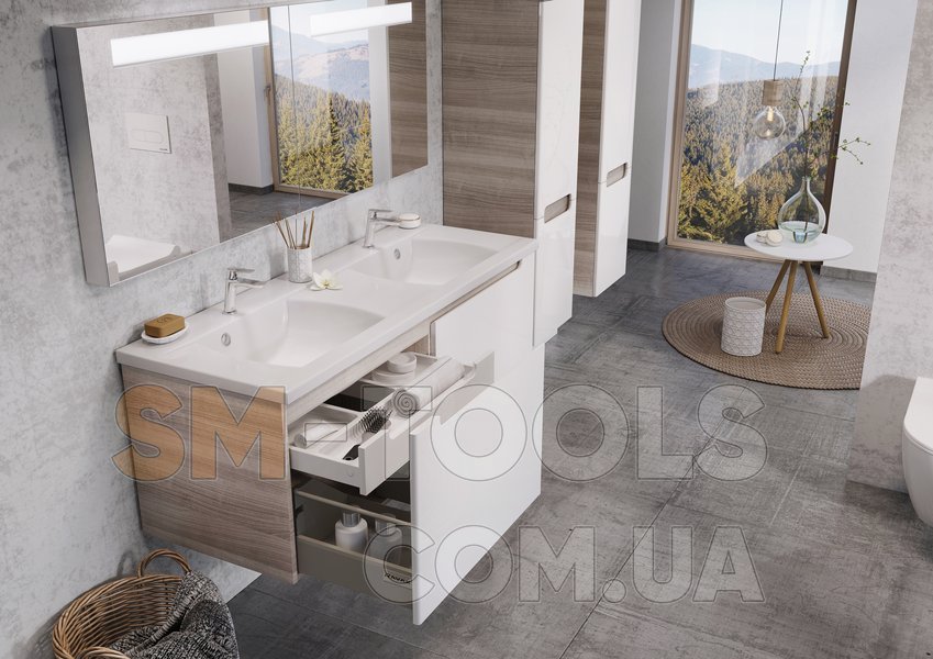 Шкафчик с двумя высокими ящиками с пространством для вещей высотой 40 см. В правой части шкафчика есть встроенный низкий выдвижной ящик, в левой части - высокий ящик с пространством для вещей высотой 40 см. В то же время просверленные отверстия для дополнительного монтажа низкого ящика, который можно докупить отдельно или свободно переставить из правой части в левую. Дверцы представлены только в белом глянцевом цвете, корпус же согласно выбранной цветовой комбинации. Корпус поставляется в собранном виде, включая монтажный набор (болты, петли, заглушки) и ручки. Шкафчик устанавливается прямо на стену, нельзя использовать регулируемые ножки MR Base. Для целостного решения и согласованного дизайна ванной комнаты рекомендуем шкафчик под двойной умывальник комбинировать с остальными изделий концепции Classic (двойным умывальником Classic 1300) и другой продукцией RAVAK.