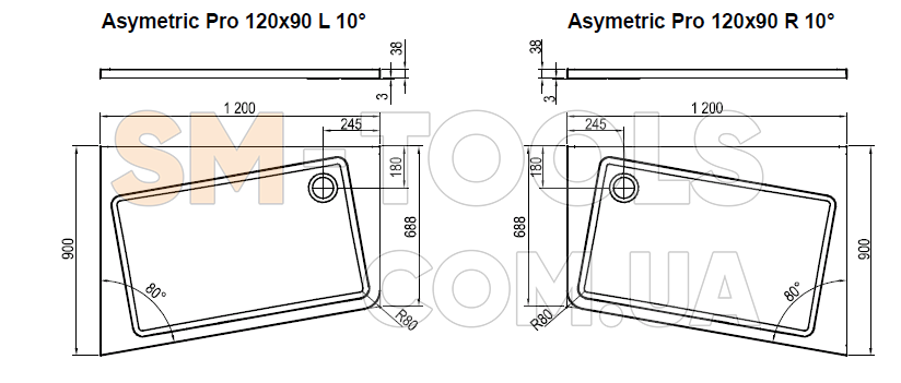 Душевой поддон Asymetric Pro 10 ° подходит для левого или правого варианта душевых кабин 10AP4. Внутри поддона Вы найдете новые практические зоны хранения косметики для ванной комнаты. В комплект есть возможность приобрести сифон для поддона, опоры (ножки), аксессуары для монтажа.