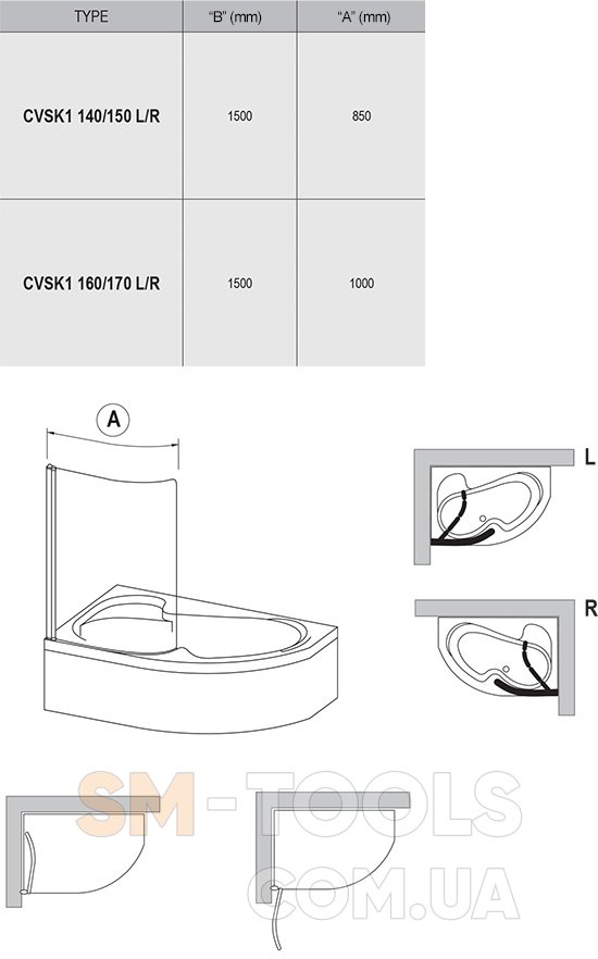 CVSK1 в L/R вариантах заказывается тех же размеров, что и ванна Rosa.