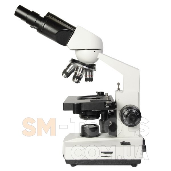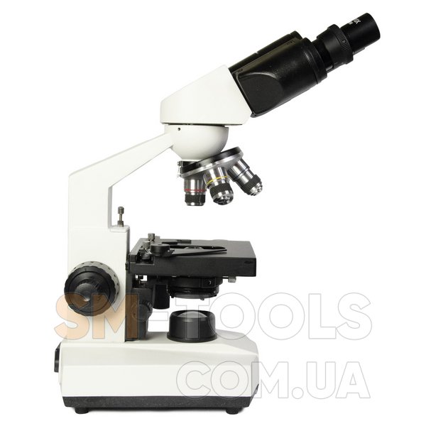 Корпус микроскопа выполнен из металла, что придает не только надежность конструкции, но и, благодаря увеличению веса и резиновым опорным ножкам, обеспечивает большую стабильность прибора и гашение микровибраций. Бинокулярная насадка незаменима для длительных рутинных наблюдений, так как способствует меньшей утомляемости глаз. Она наклонена под углом 30°, плавно поворачивается на 360°, позволяя проводить наблюдения в любом удобном положении, а также работать с микроскопом ряду наблюдателей без перемещения микроскопа в пространстве.