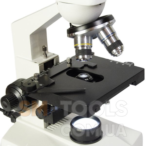 Микроскоп обеспечивает точное позиционирование объекта наблюдения под объективом благодаря наличию микрометрических винтов точной фокусировки с шагом 0.005 мм, и препаратоводителя с микрометрическими суппортами и нониусом. Столик имеет стойкое черное матовое покрытие.