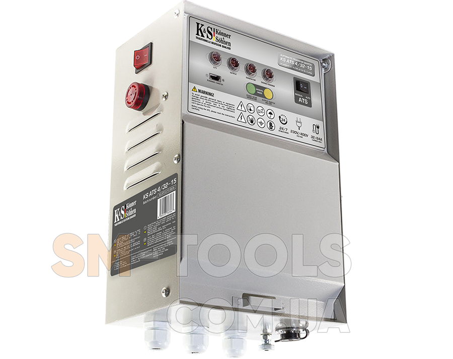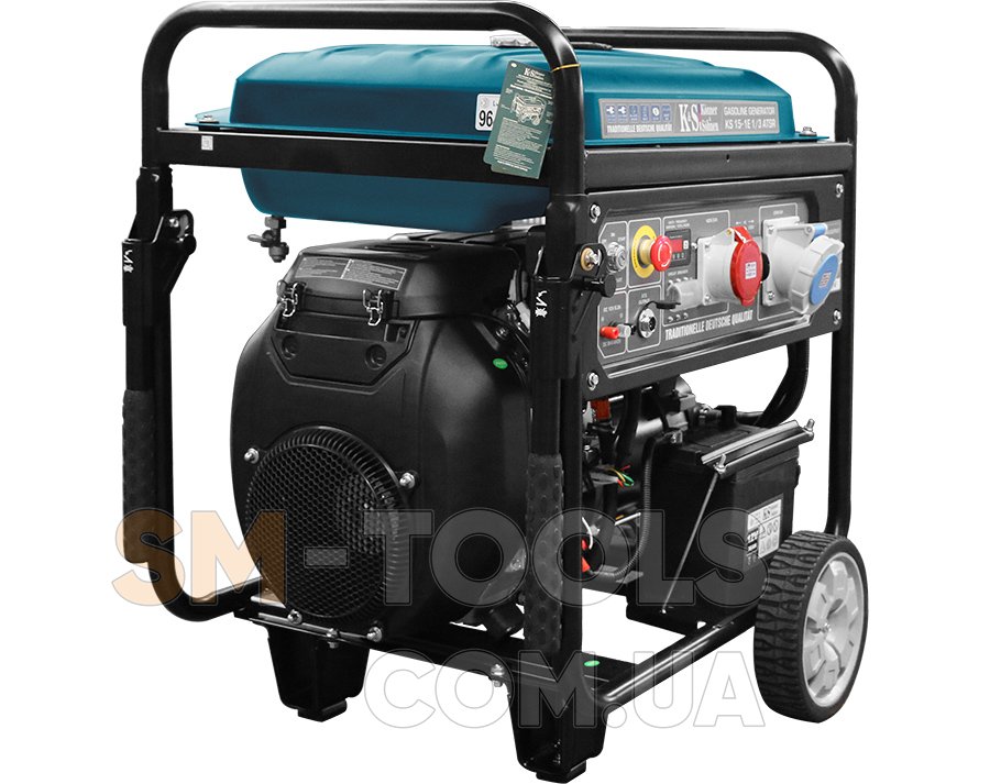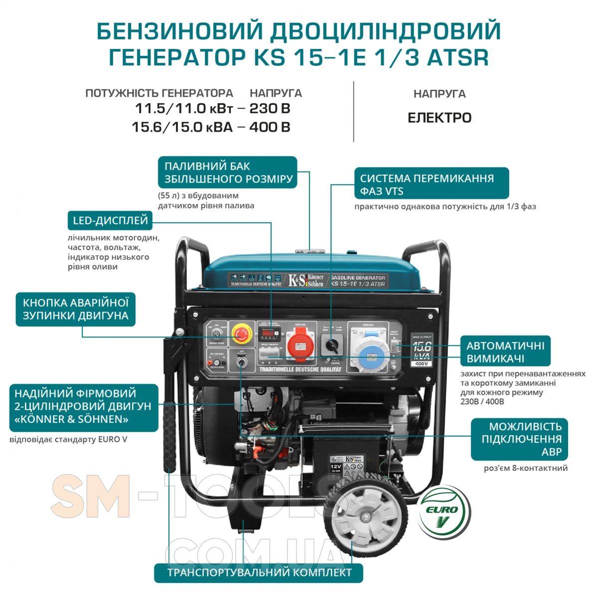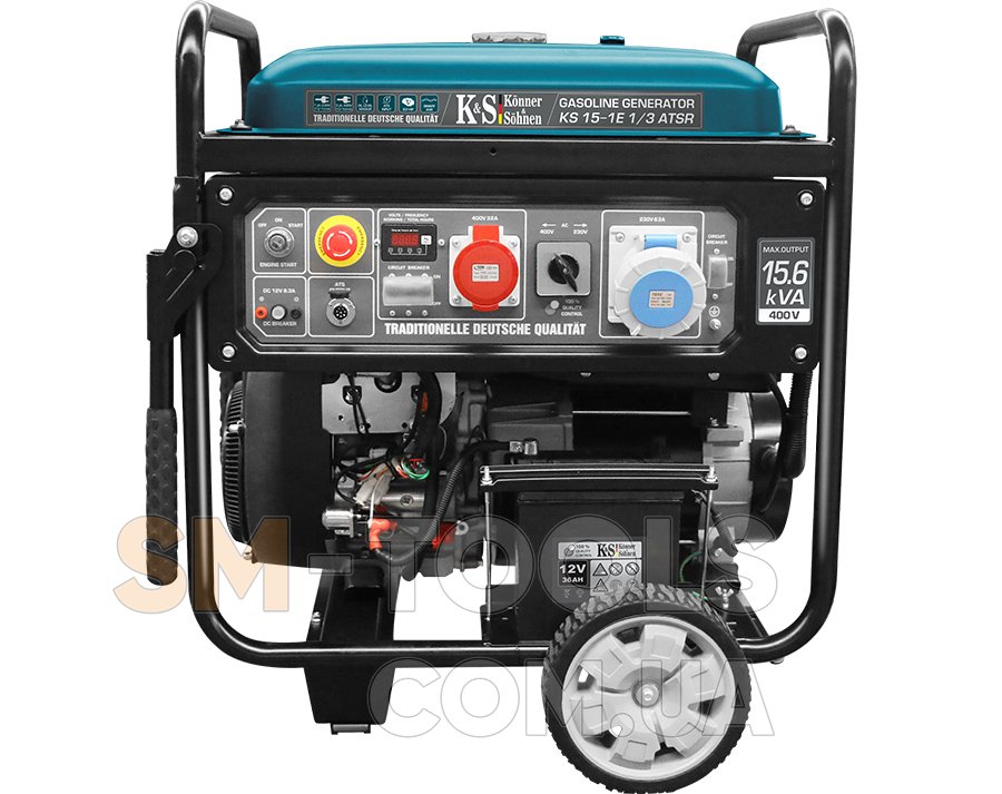 Модель генератора KS 15-1E 1/3 ATSR з унікальною технологію перемикання фаз VTS, яка дає можливість працювати в однофазному (230В) або трифазному (400В) режимі майже без втрати потужності. Зручна, ергономічна панель керування з кнопкою аварійної зупинки генератора та багатофункційним LED-дисплеєм, що дозволяє контролювати роботу генератора — напругу, частоту та кількість відпрацьованих годин. Кожна модель оснащена розетками, що дозволяють знімати максимальну потужність, яка віддається приладом, розетки обладнані запобіжниками та комплектуються відповідними вилками. Місткий 55-літровий паливний бак забезпечує тривалу і безперервну роботу.