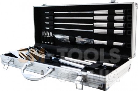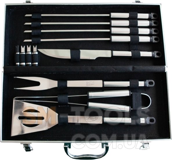 Набор аксессуаров (12 шт) для барбекю (гриля) из нержавеющей стали в благородном чемодане с петельками на липучке и резиновыми петлями для точной фиксации.