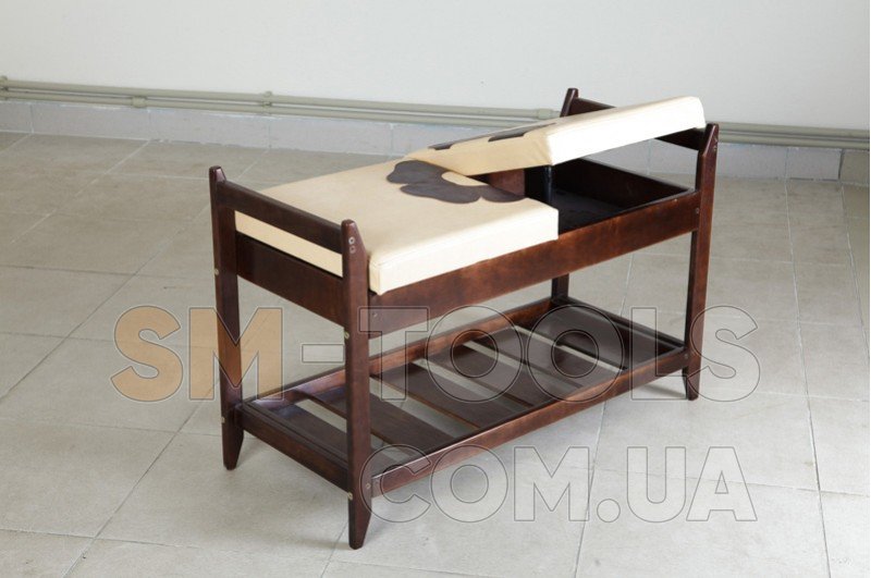Конструкция лавки оснащена полкой для обуви с небольшими бортиками, чтобы ваша обувь не упала с нее. Кроме этого, по бокам есть бортики, на которые можно повесить лопатку для обуви и она всегда будет у вас под рукой.