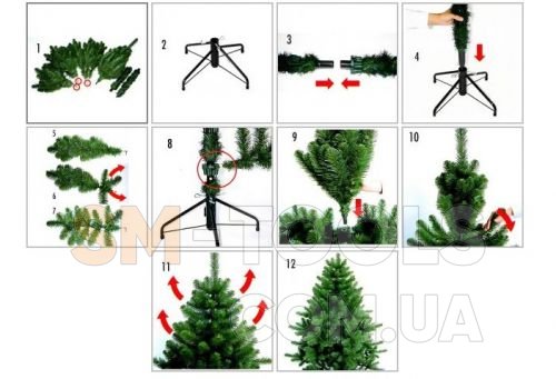 Ствол искусственного дерева разделен на несколько частей. В каждой части есть крепление для веток, промаркерованное определенным цветом. Ветки, предназначенные для этого крепления, также отмечены этим цветом, т.е. ветка с синим маркером вставляется в крепление с тем же цветом. Каждая ветка цепляется к стволу посредствам крючка, имеющимся в ее основании.