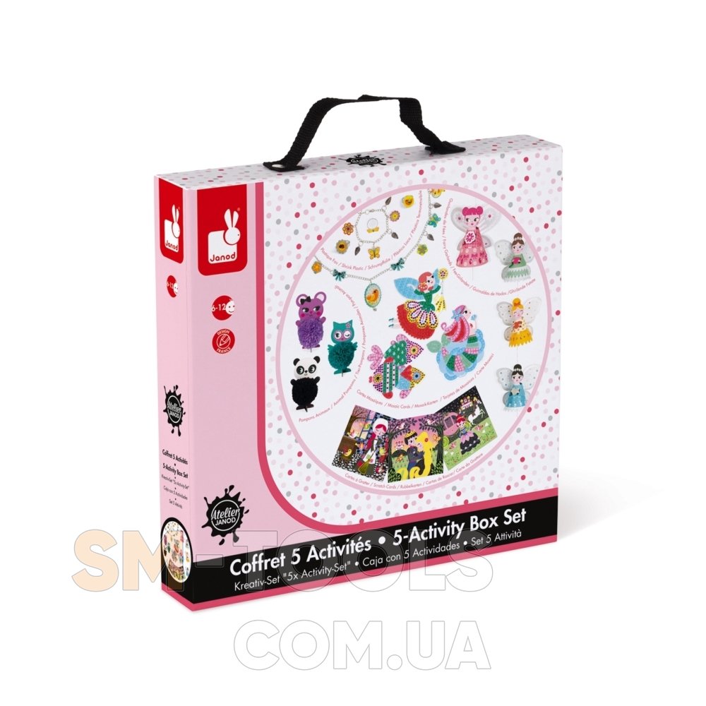 Набор для творчества Janod 5 в 1 - это 5 абсолютно разных комплектов, которые прекрасно подходят для развития и досуга ребенка. Каждый из них по-своему раскрывает творческие способности малыша и помогает найти любимое занятие. Рисование, «handmade», мозаика и создание собственных уникальных украшений. Набор содержит 25 различных деталей из картона, пластика и металла. Поставляется в картонной коробке размером 32х5,5х32 см.