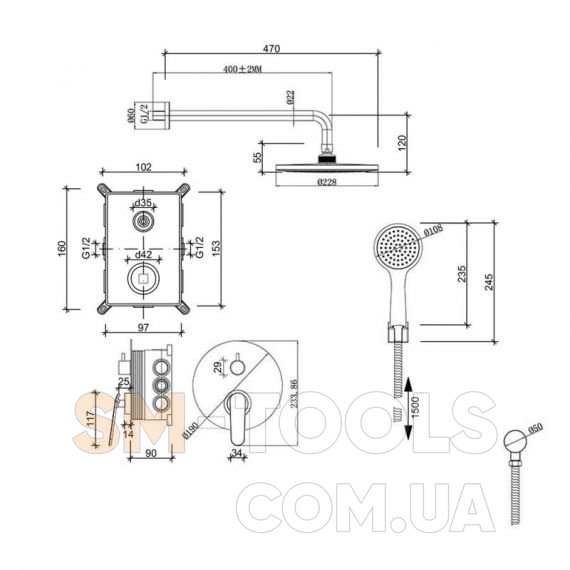 Диаметр лейки, мм: Ручной душ: 105. Верхний душ: 225