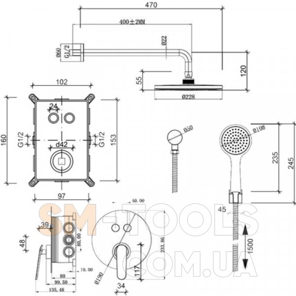 Диаметр лейки, мм: Ручной душ: 105. Верхний душ: 225