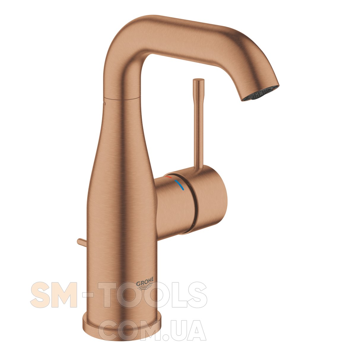 Созданный с выдающимся изогнутым изливом средней высоты, этот однорычажный смеситель для раковины GROHE Essence в цвете "Теплый закат браш" с донным клапаном станет прекрасным дополнением дизайна современной ванной комнаты или уборной.