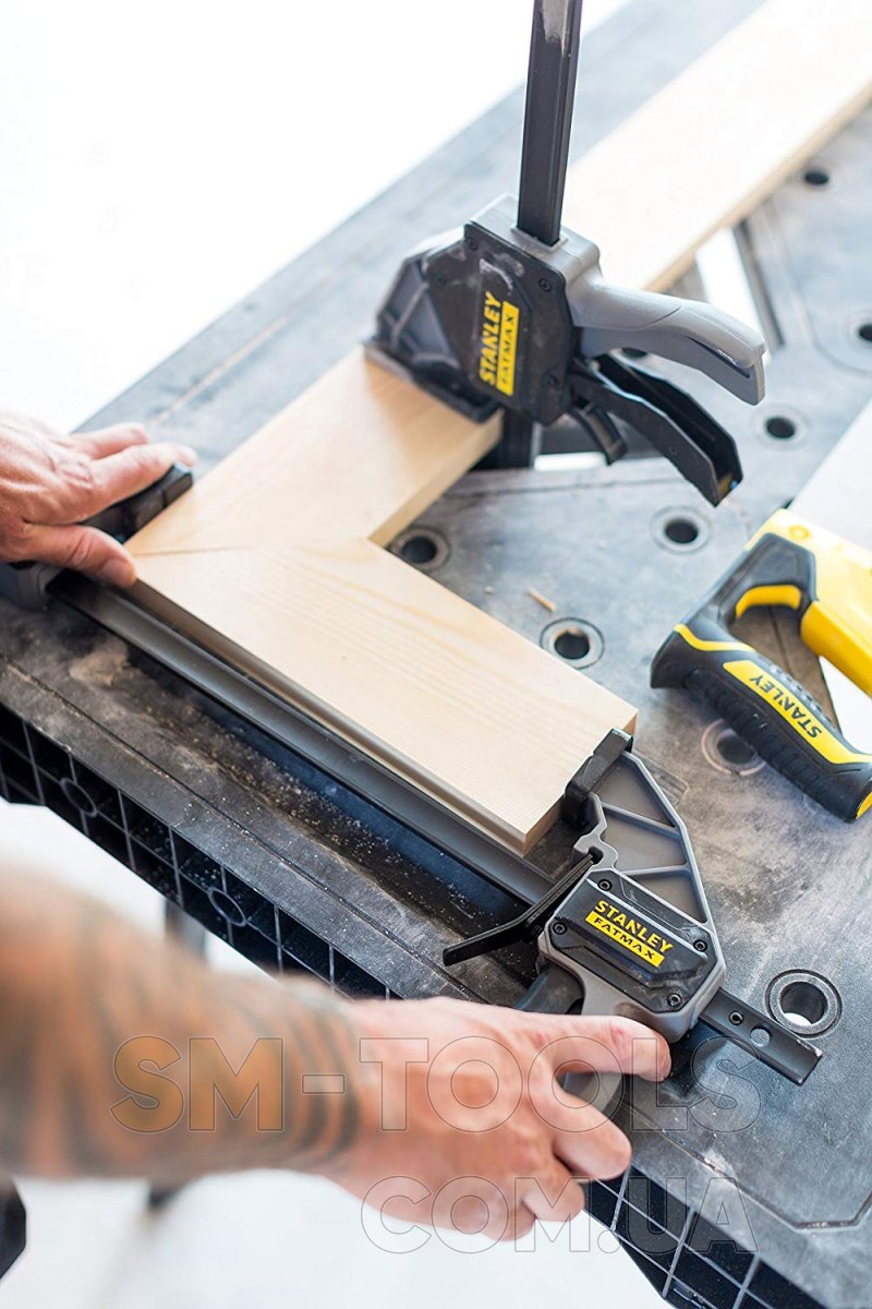 Универсальное крепление заготовки – совместимость с триггерными струбцинами линейки FatMax для самого широкого спектра применений. Большая рабочая поверхность для удобства при решении различных задач. Выдвижная рукоятка механизма разблокировки обеспечивает удобство подвеса инструмента обеспечивающее компактность при его хранении.