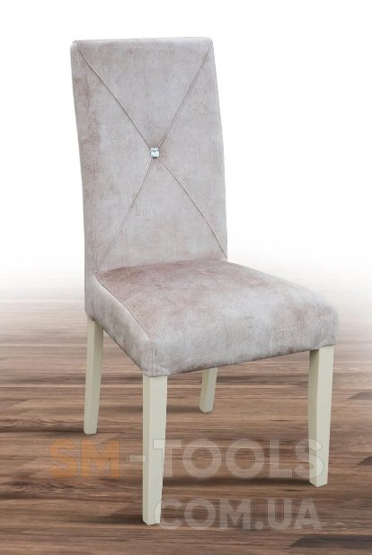 Стул Димас изготовлен из массива Бука, мягкие сидение и спинка обтянуты тканью бежевого цвета, спинка декорирована стразом.