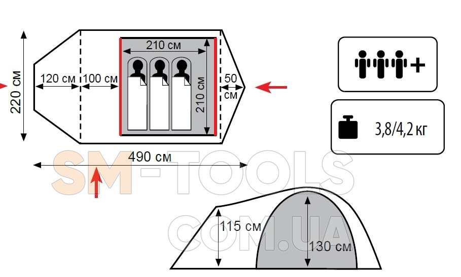Тент: 100% полиэстер 75D/190T WR PU 4000 мм в. ст.