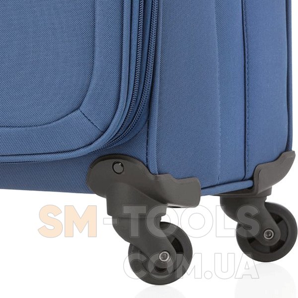 Чемодан оснащен четырьмя полноповоротными колесами с возможностью независимого разворота каждого колеса на 360°. Системой предусмотрено равномерное перераспределения нагрузки на каждое колесо, что в свою очередь способствует плавному качению и маневренности чемодана, прилагая при этом минимум усилий. Колеса изготовлены из высокотемпературного термопластичного полиуретана (TPU). Материал обладает прочностью сравнимой с пластиком, гибкостью силикона, а так же имеет повышенную устойчивость к перепадам температур. Отличительной особенностью колес из TPU материала является снижение шума до минимума при качении чемодана по неровной поверхности. Благодаря устойчивости к истиранию материал колес отличается длительным сроком эксплуатации.