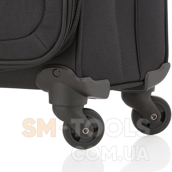 Чемодан оснащен четырьмя полноповоротными колесами с возможностью независимого разворота каждого колеса на 360°. Системой предусмотрено равномерное перераспределения нагрузки на каждое колесо, что в свою очередь способствует плавному качению и маневренности чемодана, прилагая при этом минимум усилий. Колеса изготовлены из высокотемпературного термопластичного полиуретана (TPU). Материал обладает прочностью сравнимой с пластиком, гибкостью силикона, а так же имеет повышенную устойчивость к перепадам температур. Отличительной особенностью колес из TPU материала является снижение шума до минимума при качении чемодана по неровной поверхности. Благодаря устойчивости к истиранию материал колес отличается длительным сроком эксплуатации.