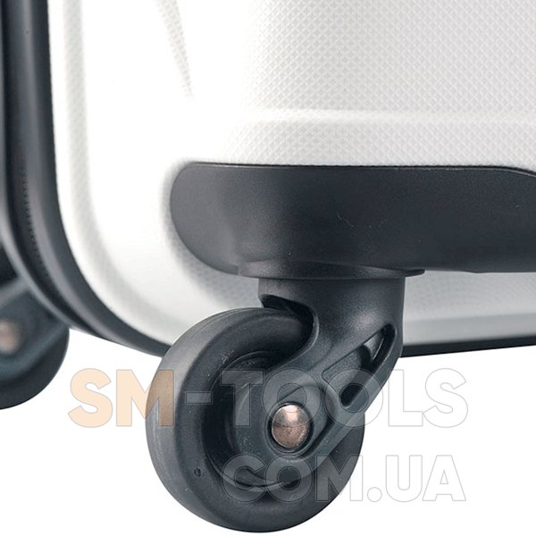 Чемодан оснащен четырьмя полноповоротными колесами с возможностью независимого разворота каждого колеса на 360°. Системой предусмотрено равномерное перераспределения нагрузки на каждое колесо, что в свою очередь способствует плавному качению и маневренности чемодана, прилагая при этом минимум усилий. Колеса изготовлены из высокотемпературного термопластичного полиуретана (TPU). Материал обладает прочностью сравнимой с пластиком, гибкостью силикона, а так же имеет повышенную устойчивость к перепадам температур. Отличительной особенностью колес из TPU материала является снижение шума до минимума при качении чемодана по неровной поверхности. Благодаря устойчивости к истиранию материал колес отличается длительным сроком эксплуатации.