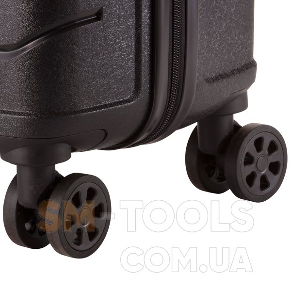 Чемодан оснащен четырьмя полноповоротными колесами с возможностью независимого разворота каждого колеса на 360°. Системой предусмотрено равномерное перераспределения нагрузки на каждое колесо, что в свою очередь способствует плавному качению и маневренности чемодана, прилагая при этом минимум усилий. Колеса изготовлены из высокотемпературного термопластичного полиуретана (TPU). Материал обладает прочностью сравнимой с пластиком, гибкостью силикона, а так же имеет повышенную устойчивость к перепадам температур. Отличительной особенностью колес из TPU материала является снижение шума до минимума при качении чемодана по неровной поверхности. Благодаря устойчивости к истиранию материал колес отличается длительным сроком эксплуатации.