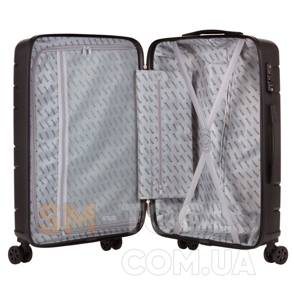 - Чемодан разделен перегородкой на молнии на два основных отделения.