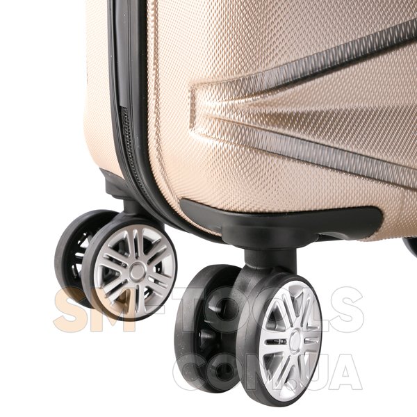 Чемодан оснащен четырьмя полноповоротными колесами с возможностью независимого разворота каждого колеса на 360°. Системой предусмотрено равномерное перераспределения нагрузки на каждое колесо, что в свою очередь способствует плавному качению и маневренности чемодана, прилагая при этом минимум усилий. Колеса изготовлены из высокотемпературного термопластичного полиуретана (TPU). Материал обладает прочностью сравнимой с пластиком, гибкостью силикона, а так же имеет повышенную устойчивость к перепадам температур. Отличительной особенностью колес из TPU материала является снижение шума до минимума при качении чемодана по неровной поверхности. Благодаря устойчивости к истиранию материал колес отличается длительным сроком эксплуатации.