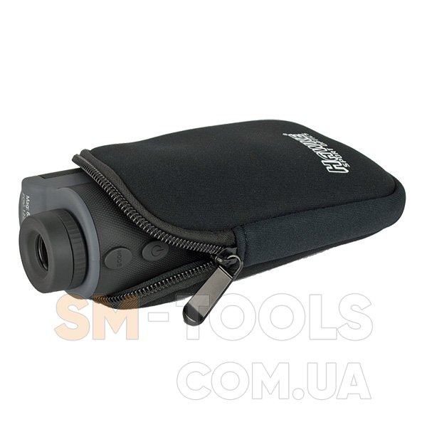 Легкий поликарбонатный корпус имеет специальную эргономичную форму и покрыт резиновым покрытием с профилированной накаткой, дальномер надежно фиксируется в руке. Кнопки управления расположены в удобном месте таким образом, что дальномером будет одинаково легко пользоваться и левшам и правшам. Фокусировка и поворотно-выдвижной наглазник обеспечивают достаточный комфорт наблюдения. Чехол имеет утолщенные мягкие стенки, молнию, карабин и крепление на ремень.