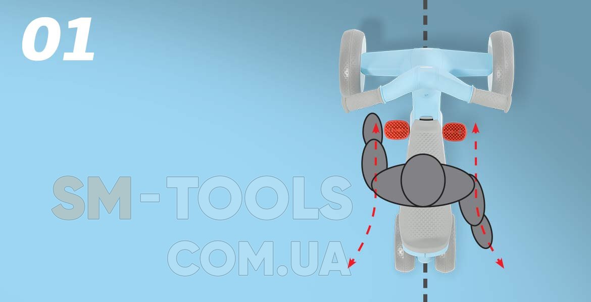 В этом веломобиле складываются педальки, сидение и ручки управления не скользят, а колёса не царапают даже паркет, линолеум и прекрасно ведут себя на покрытиях типа ковролина или напольных пазлов.