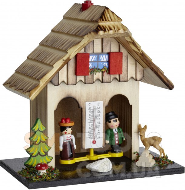 Чистая ностальгия! Этот маленький погодный домик, как и во времена прабабушки, является классическим гигрометром. Синтетические волосы реагируют на влажность и соответственно сокращаются или расширяются. В сухую погоду из домика появляется женщина; в сырую погоду мужчина подходит к двери. Термометр также измеряет температуру.