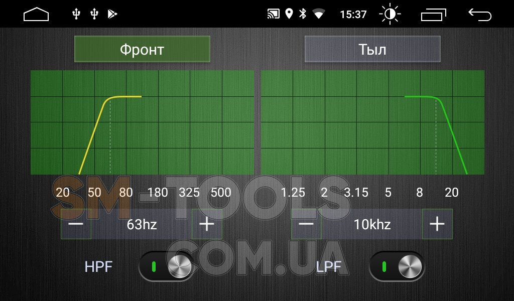 Тонкая настройка баса. По сути, басовый параметрический эквалайзер. Выберите центральную частоту и коэффициент её усиления. Добавьте баса там, где это необходимо. Функция «Гармоника» автоматически восстанавливает гармоники низких частот, потерянные при сжатии аудиофайлов. Вы поймете это, сравнив звучание DTA магнитолы с обычным автомобильным ресивером, на заводских («нулевых») аудио настройках.