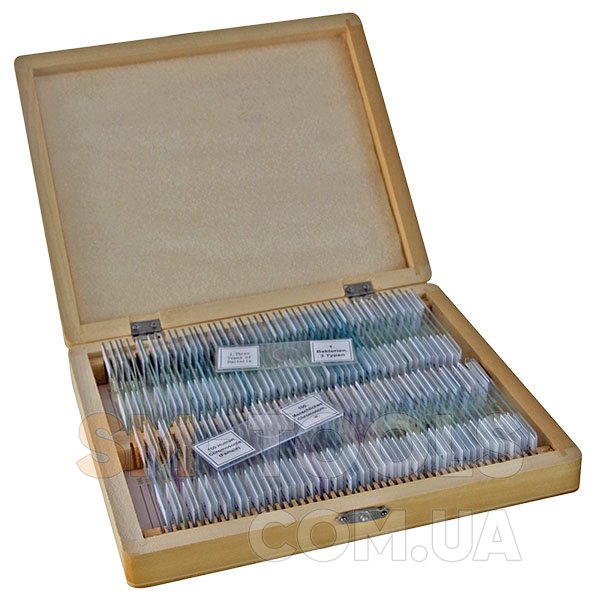 Набор специально подготовленных образцов (слайдов) для исследования под микроскопом. Большинство образцов обработаны специальными веществами для повышения контраста. Набор включает как образцы раститений и микроорганизмов, так и фрагменты тканей насекомых, рыб, животных и человека.
